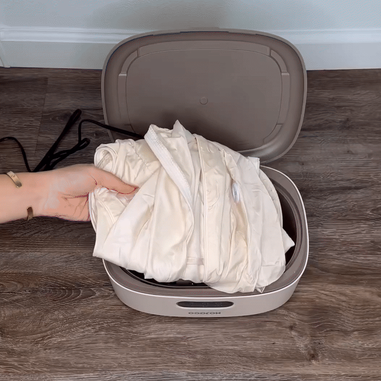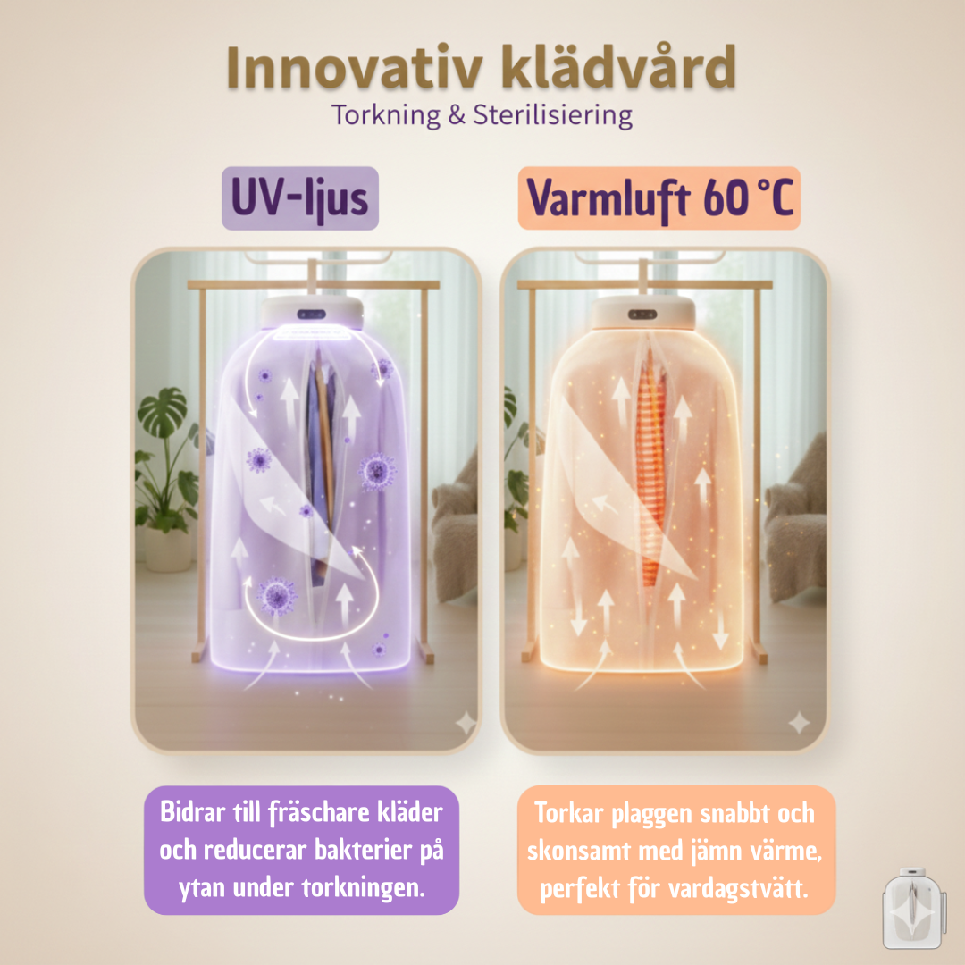 Inbyggt UV-ljus ger plaggen en fräsch känsla under torkningen.